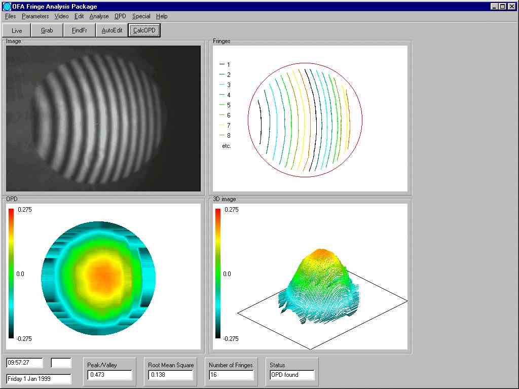 The top level screen shows the live video input (top left), detected fringes (top right), OPD map (lower left) and OPD 3-D plot (lower right). A summary of the OPD and r.m.s. measurements are displayed at the bottom of the screen and more detailed analysis functions are available from the analysis sub-menu.